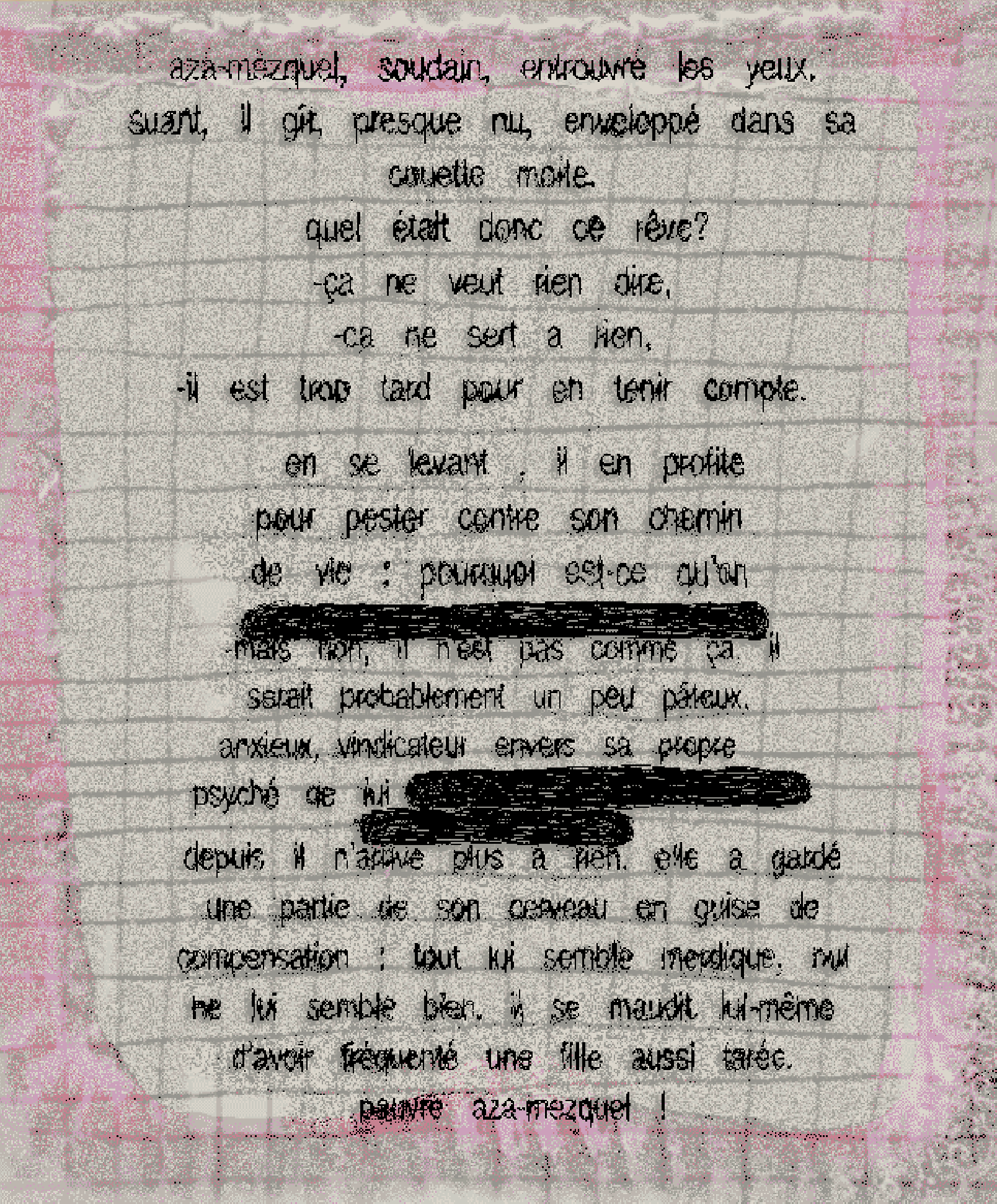 on ne pourrait bientôt plus finir le soûper sans qu'il en pleuve un autre : nouvel écorchement le rendait à la terre; mes cadavres étaient les nouvelles intempéries de ce monde en huis-clos, accompagnées de son dôme les vertèbres de la bête.