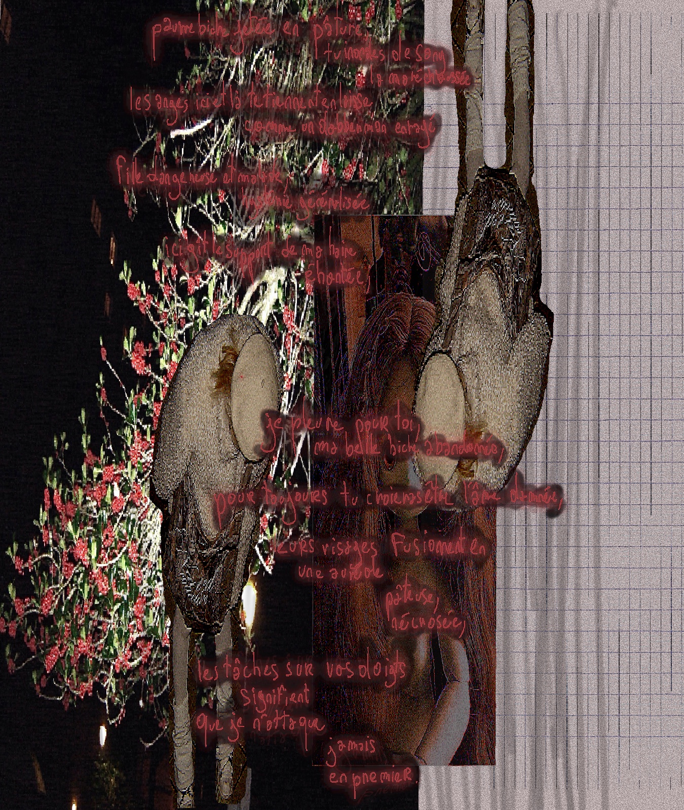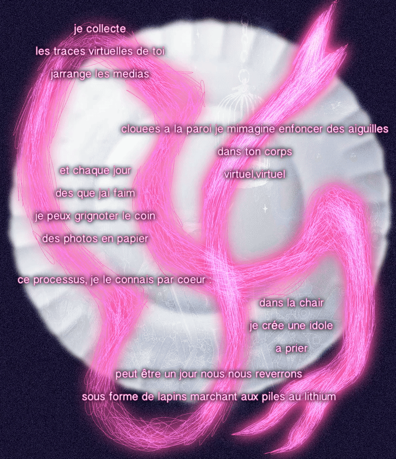 "règlement de compte esthétisés,narcissisme glorifié, metempsychose, manifestation, si j'y crois c'est que c'est réel, j'explore mes délires psychotiques influencés par les images qui bougent. je noue des rubans autour des chaises en osier"